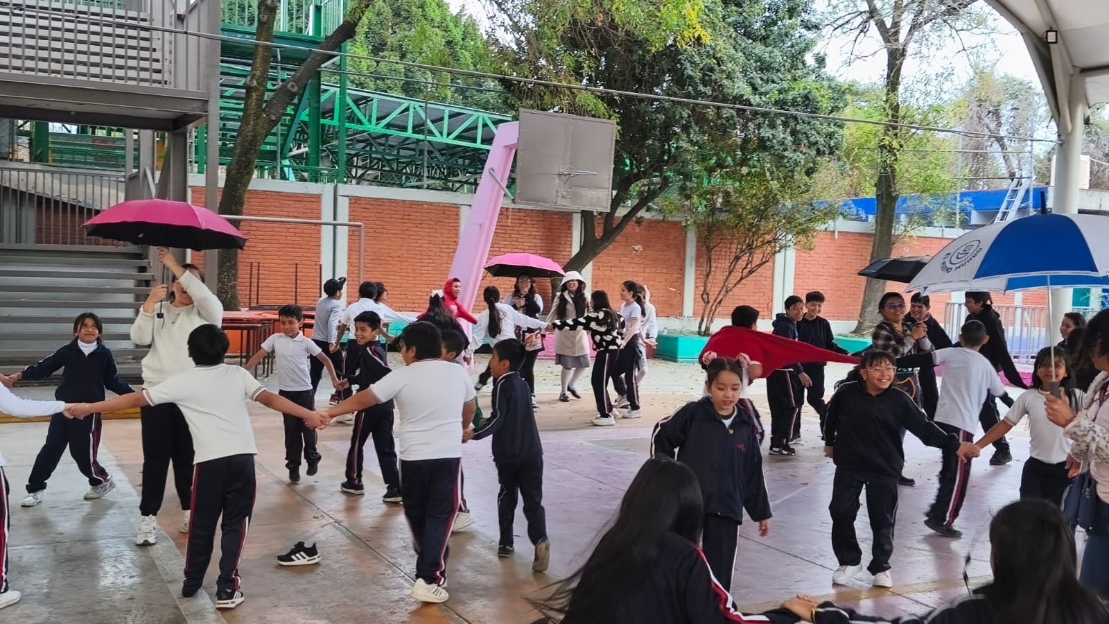 “Los alumnos trabajan en equipos y utilizan la sombrilla como parte del reto motor y cooperativo. Generalmente se organizan en grupos donde deben sostener la sombrilla entre varios compañeros y realizar diferentes desafíos sin soltarla, como caminar en coordinación, recorrer un circuito con obstáculos, transportar una pelota encima de la sombrilla sin que se caiga o realizar cambios de dirección al escuchar una señal.