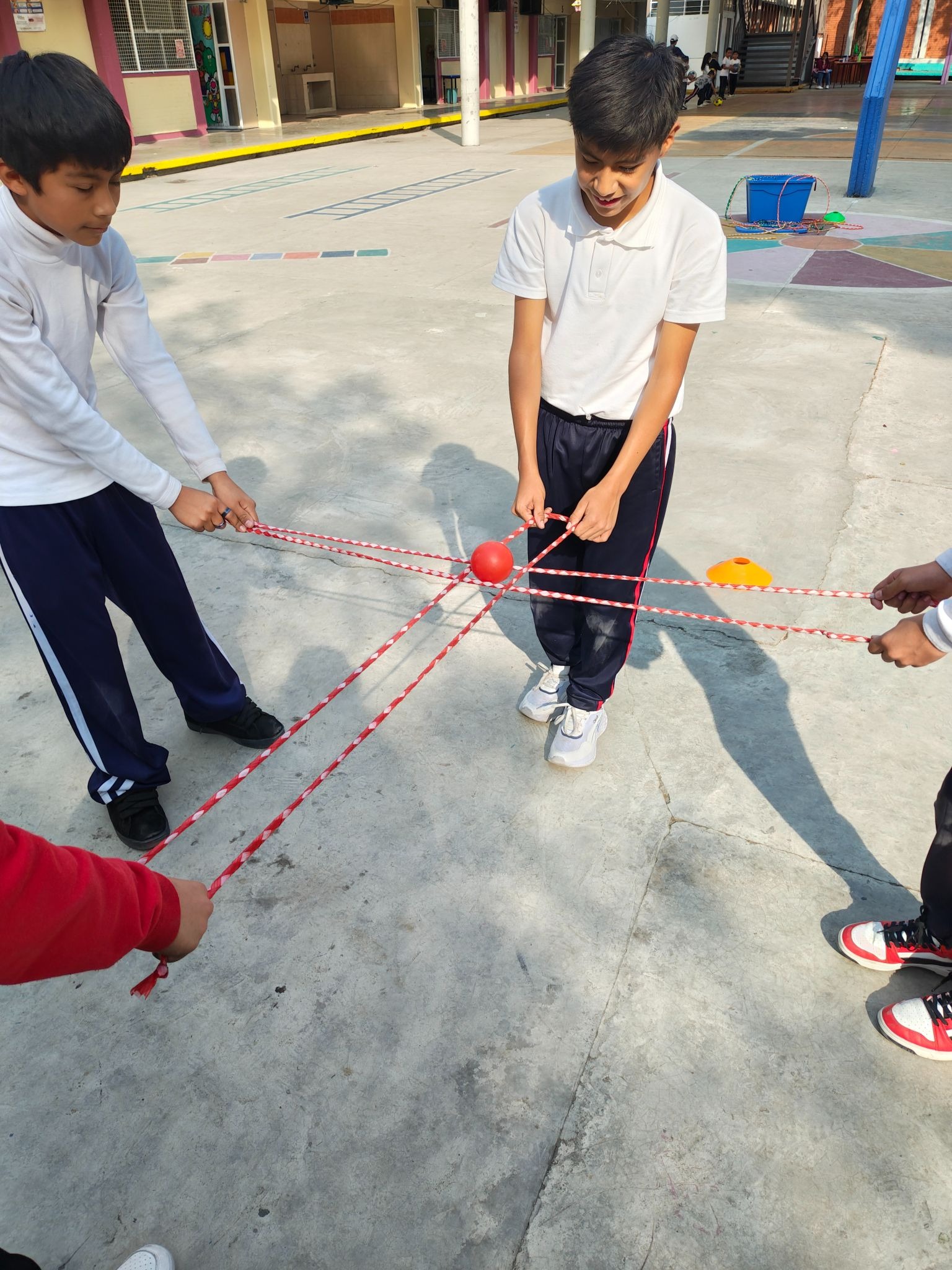 “Los alumnos de 4to y 6to, participaron en esta actividad, formando equipos de 4 o 5 integrantes. Consiste en que los alumnos tendrán que llevar una pelota de un punto a otro utilizando cuerdas, buscarán mantener tensas las cuerdas para evitar que la pelota caiga, de ser así, la volverán a colocar en el plato y lo intentarán nuevamente. Fortalecimos habilidades como la coordinación en equipo, comunicación, tolerancia, etc.”