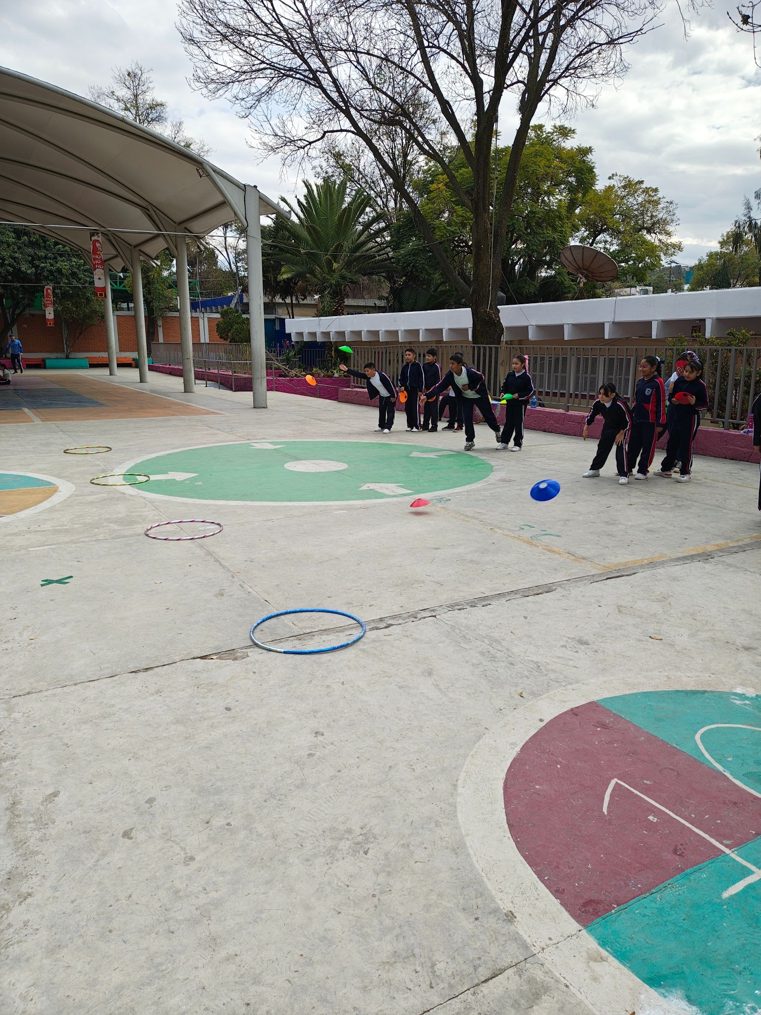 “Los alumnos se organizan en equipos, a una distancia determinada, lanzarán platos señaladores hacia un aro buscando que caiga dentro de este, cada integrante del equipo debe conseguir el objetivo. Actividad ideal para mejorar habilidades como lanzamiento, precisión, comunicación entre pares.”